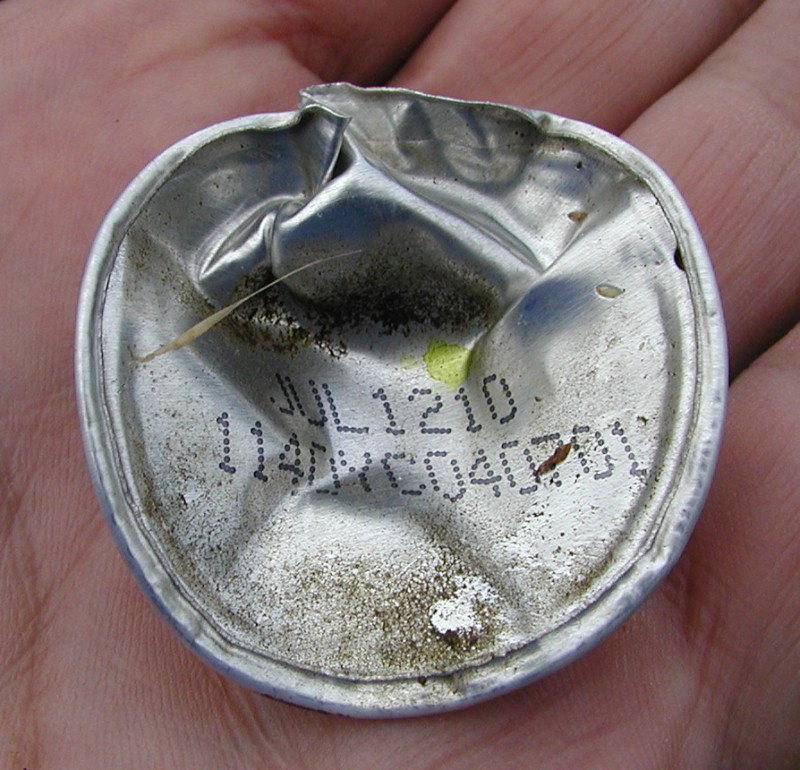 The can was found next to me.  I took a photo before touching it.  I found it unusual the center of the bottom is gone.  I did not find it.