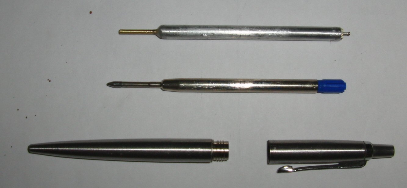 Here's my latest pengun, it's designed to fit into an existing pen without modifying the casing. In this regard external dimensions are very similar to the ballpoint refill it will replace.