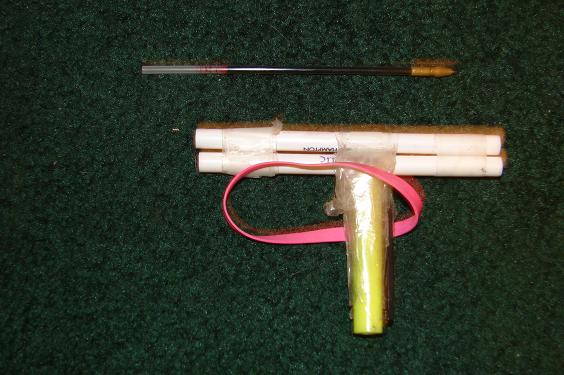 All it is is a mechanical pencil and you break the thing where you break it off by the tip and then you stick a rubber band over the eraser, pull it back, put something in the pencil tube, and then let go....
