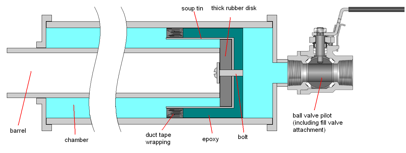 For a relatively large piston I would definitely make it cup shaped, to save on material and weight. Here's roughly how I would put it together:Atattack wrote:JSR, that tutorial on how to cast a epoxy piston is great. In the pics it looked to be a cup piston, with the piston being a 4 inch diameter should I do a cup piston or the piston that is a plain cylinder? Would epoxy be the best material? Was thinking about having foam in the middle as you mentioned because I'm a little concerned with that large of a piston flying back with 200-300 psi.