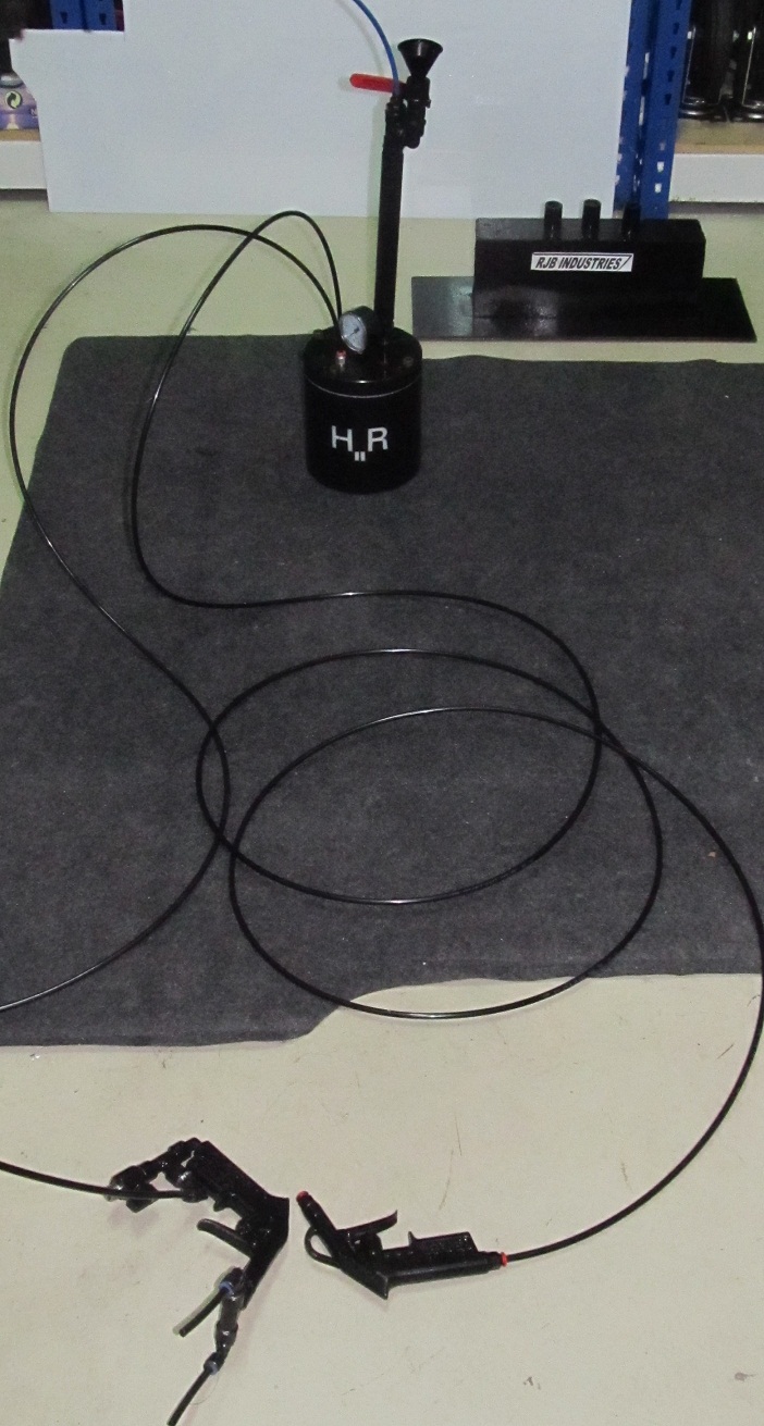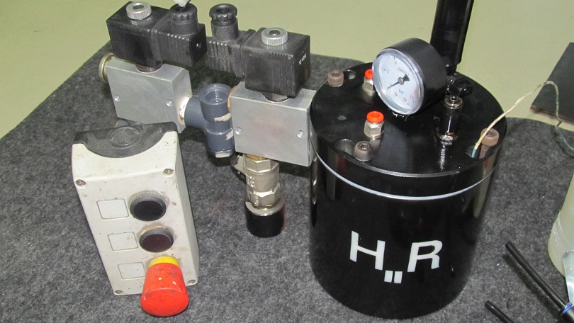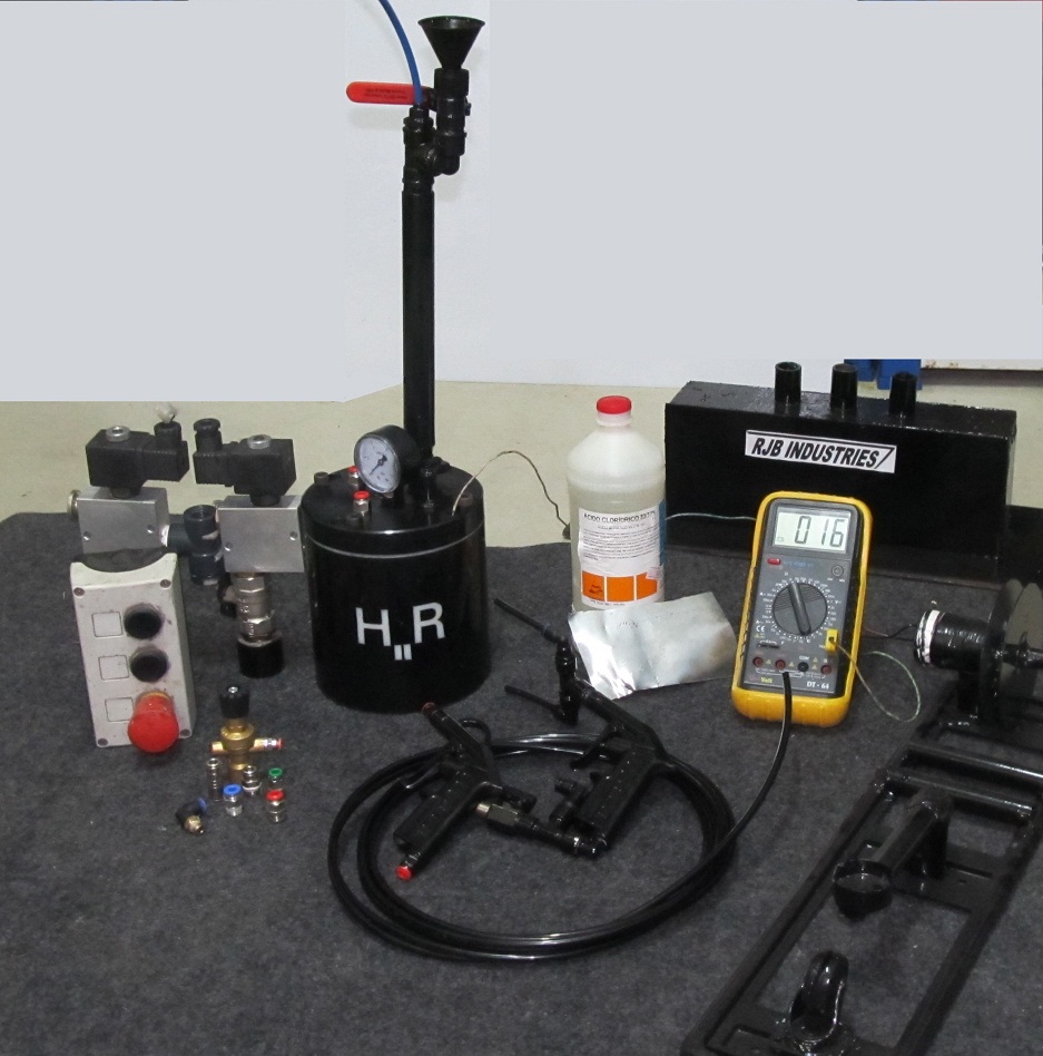 The reactor as all of you Know has a safety valve and I have also put in a valve,(pistol one) that i have with me while the reaction is active, to reduce the pressure inside the H2Reactor, it reaches 4 bars, today I have filled a ballon with H2 and did a fire test, with a remote ignition system i have done and shown in the following picture, i had used Zn instead of Al because Zn is more reactive so it produces the final product really fast, the ZnCl2 didn´t react with the nylon as I first thought to do and the H2R also has a Pressurized Injection System (PIS) designed by me that consists in not only the use of gravity force to put the HCL in the H2R, it is a chamber, PVC chamber to not react with the HCL, and it has another valve,(pistol one) in my hand that is connected with my compressor, at 4bars, and it injects all the HCL (0.5L), inside the H2R.(I have used an electrolysis but it was to slow... and with my scrubber on H2R it is now a better option to follow.