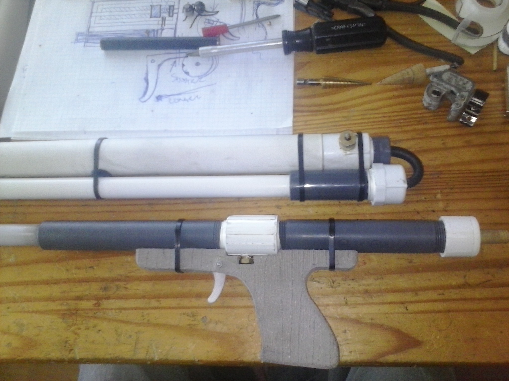 My reason is the if the one-way valve on the pump fails , the pump rod will eject toward the user. Not what I want to have resting on my cheek. So the volly gun below will turn into a huge under-over pistol with "revolver-style hammer" pilot trigger.Eh?