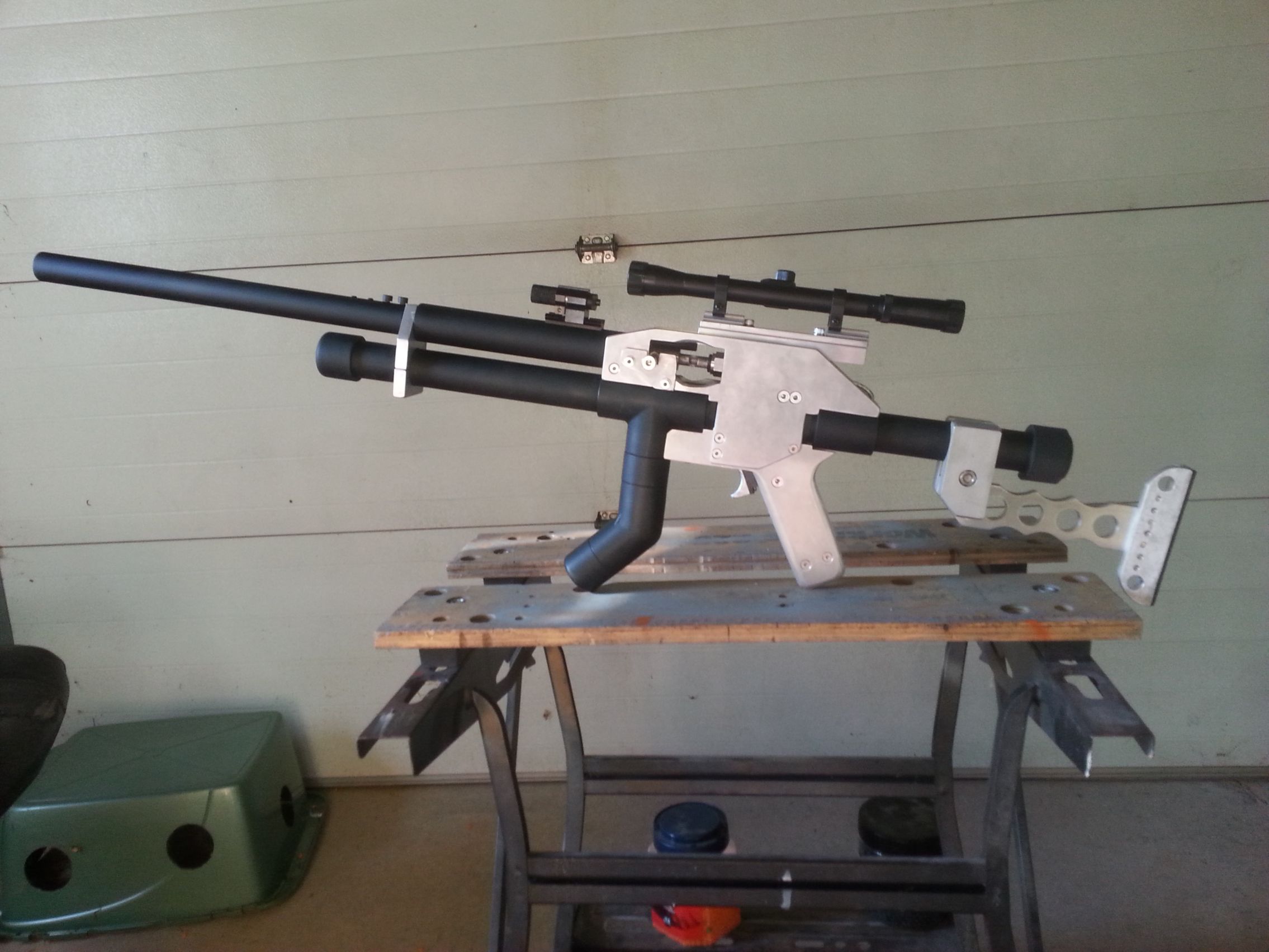 So I got it finished quite quickly today, 2 barrel sleeves and spacers made and painted. Turned out looking better than I ever thought it could. Barrel extension is removable with 2 bolts, stock with 1 bolt.