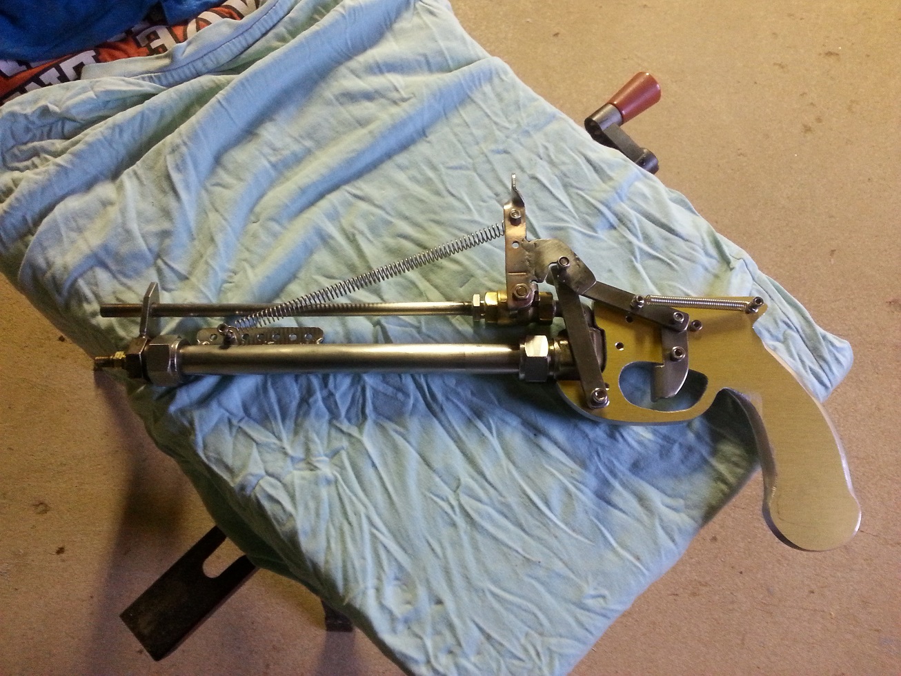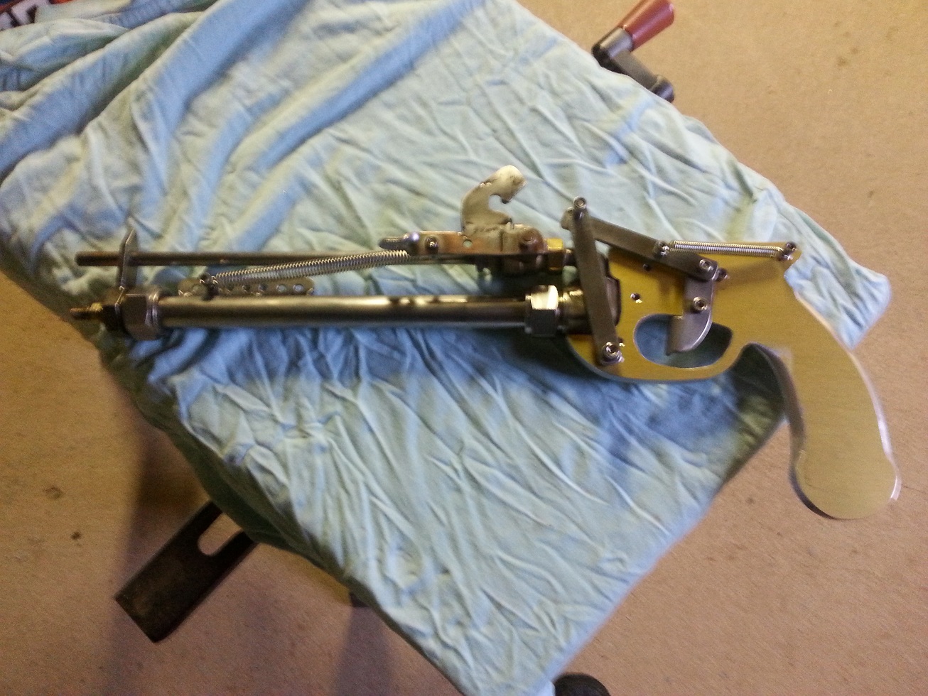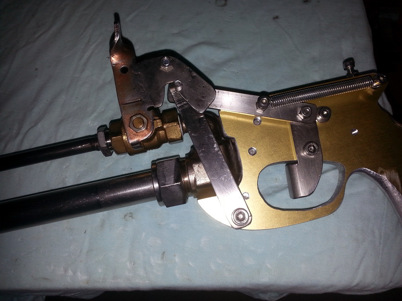The Rube Goldberg ready for first test fire, the ball valve does leak a bit as predicted so the shot has to fired quickly after the chamber is charged, might try and shim the seal to try and stop the leak. Fired 6mm airsoft in the 1/4" barrel and it was reasonably accurate at short distance. Mechanism works great and trigger pull is quite light.