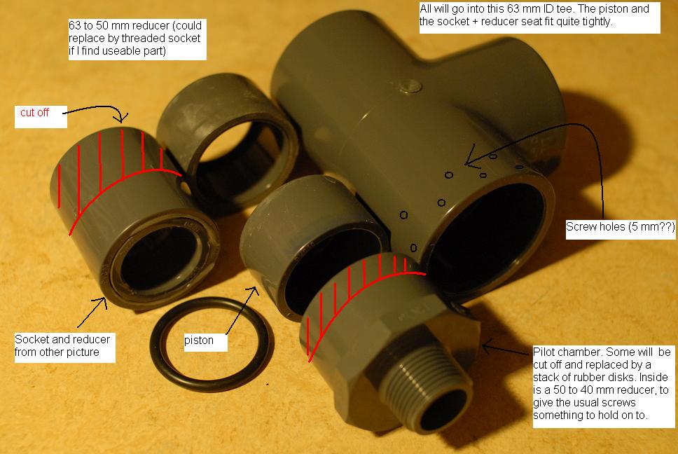 - Am I on the right track with the sealing ring diameter vs. the piston diameter? (49 mm : 60 mm) ? Larger seal diameter? The next O-ring I can get (apart from metric, which I didn't consider) is 46.99 mm ID; that will be 57.65 mm OD, which will leave very little wall after a groove is cut in a 60mm OD fitting. On the other hand, a larger (and maybe thinner) ring could help me eliminate the reducer in the valve seat.