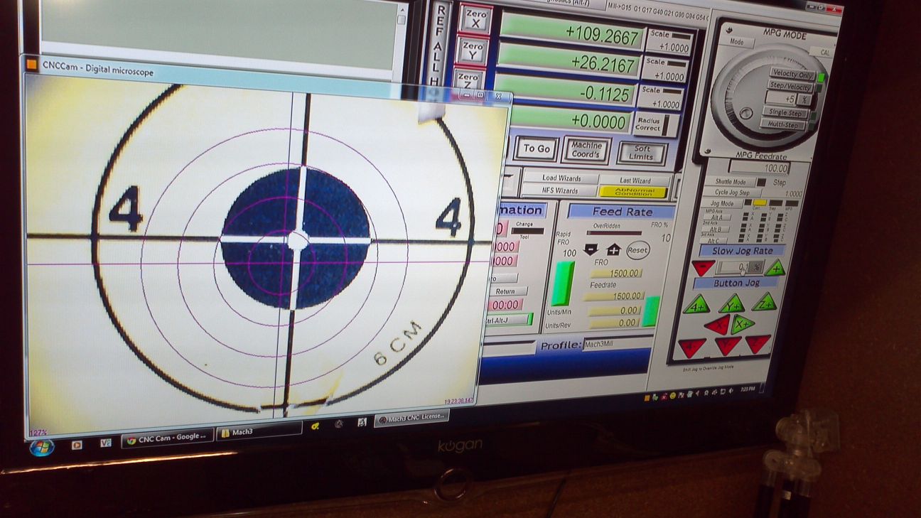 The video (to follow soon) should be self explanatory. Once I calibrate Mach3, I just need to configure a button on the screen using the free editor and allow for the offset of the camera.