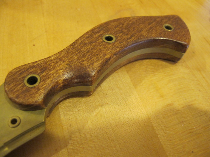 Brass layered design. 18gauge brass w/poplar scales, treated stained and polyurethane. Blade is 3.5"