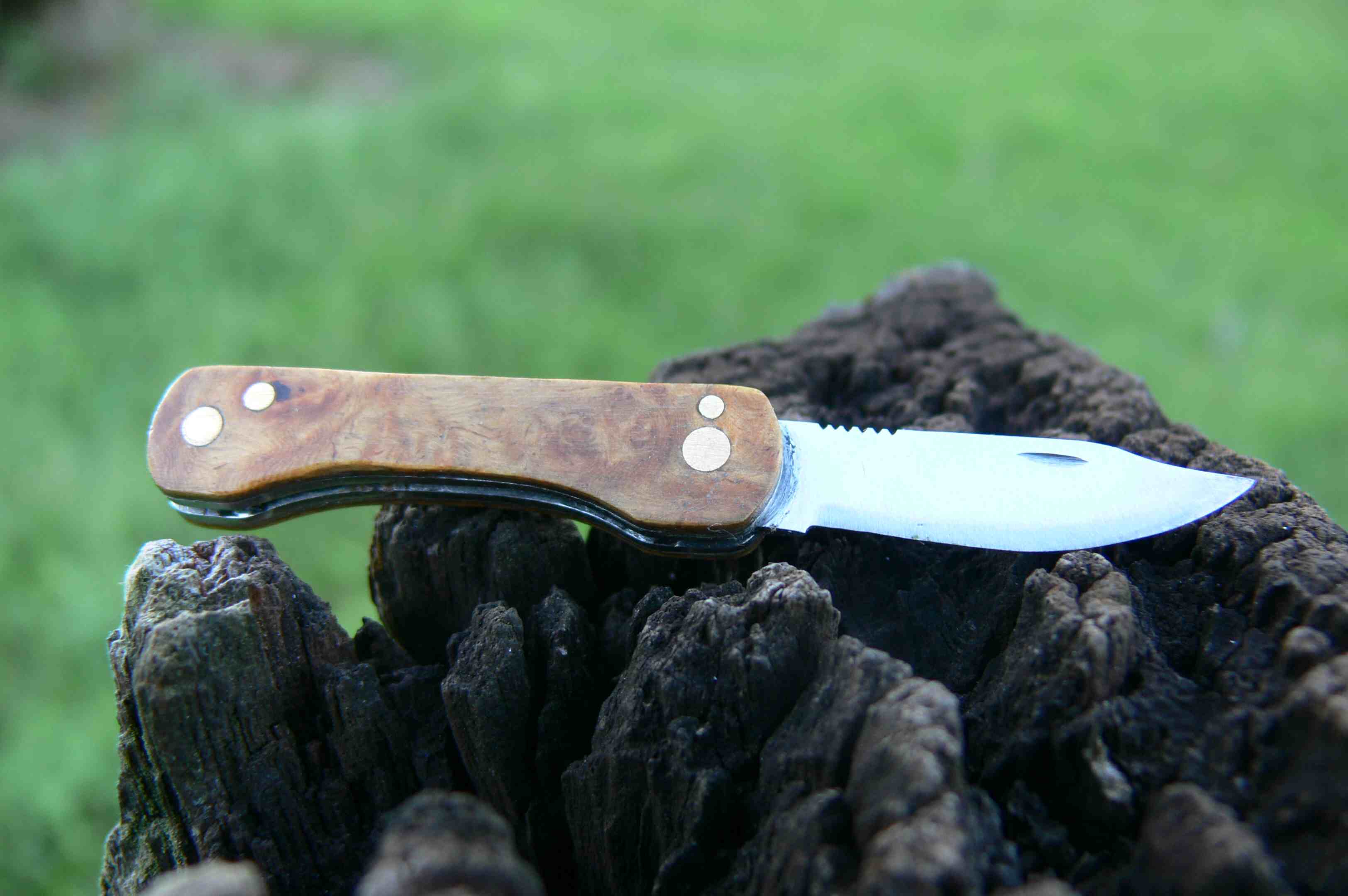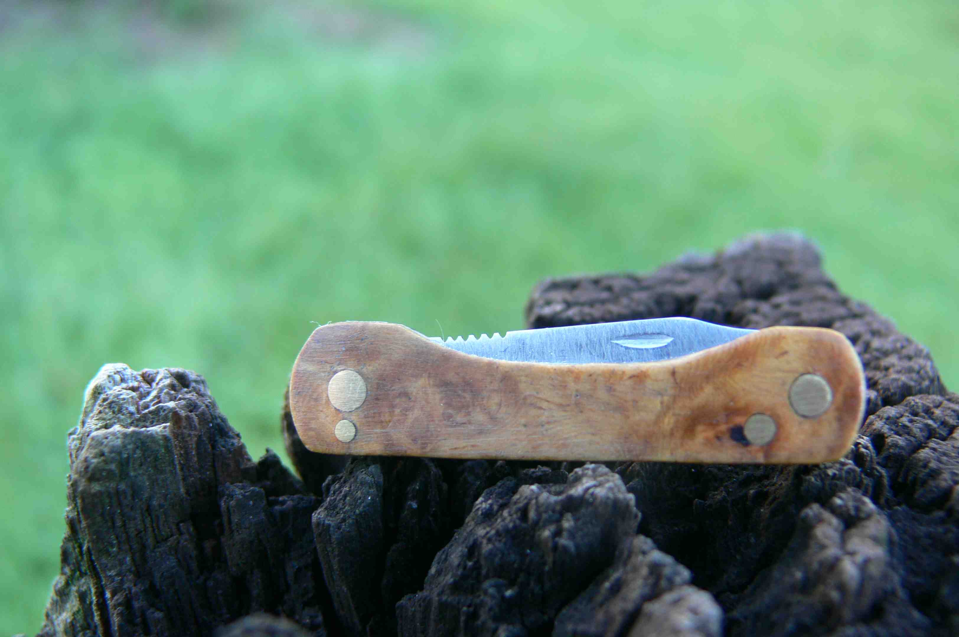 hey, thought i would post a couple of my knives i just made, they need a but of sharpening and buffing but i thought wile there was some ok light i would get some photos, the fixed blade is 5cm long from point to end of handle with a wooden sheath and the folding knife it 4cm and 7cm with the blade is out and a burl handle, both blades are stainless steal from an old ruler, what you guys think?