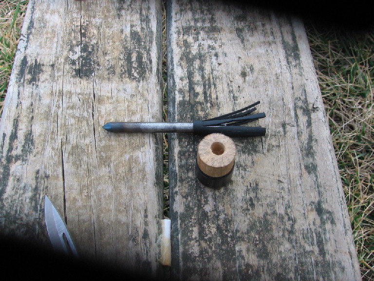 Take a 4" long 1/4" steel rod, chuck into a drill and sharpen on a grinder or belt sander, then take 2.5" of 3/16" rubber vacuum hose and slice 2.25" of "feathers" into it,then you slide the tube onto the steel dart(it's a tight fit) until you've got 1/2" of the rod coming past the start of the "feathers", then you take a piece of 1" wooden dowel slightly longer than an inch, and drill a 1/4" or 9/32" hole in the center about 5/16" deep, when loading fold the feather toward the front of the dart and insert the exposed shaft into the dowel (you don't want it to snug of a fit to ensure seperation, but not so loose as to allow the dart to just rattle around)....