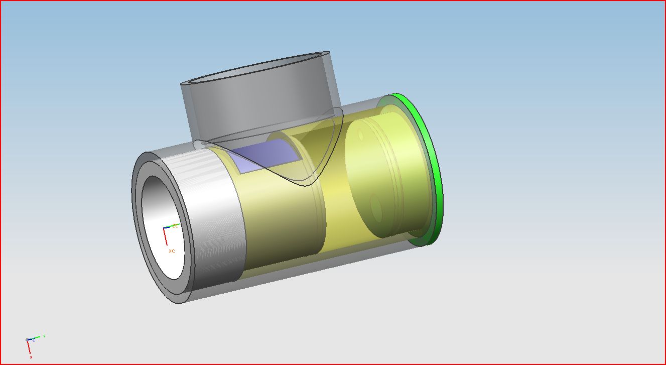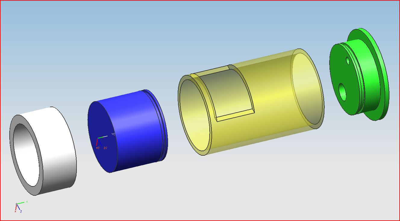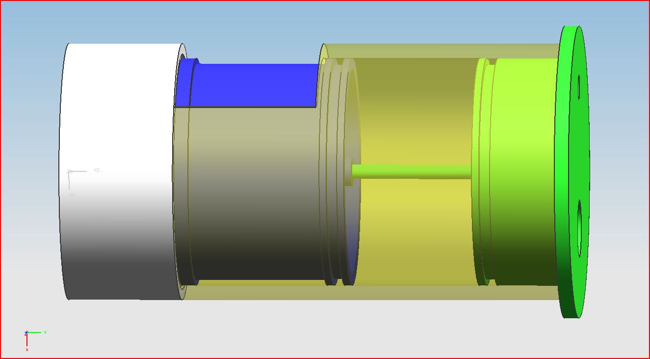 This is another valve design that i drew up in NX5. Basically modified the old valve. The grey tee is your standard sched. 40 PVC tee, but the inside is machined out so the yellow "sleeve" can be placed inside. The sleeve is made out of sched 40 as well with the inside also machined out for a good sealing surface for o-rings. The blue piston and the green back plate are both machined out of type 2 pvc. On the back plate there is a fill hole (small), and the dump hole which goes to a sprinkler valve. There's a 1/8 inch equalization hole through the center of the piston. The grooves in the green and blue are there for o-rings. The white bushing will be the opening for the tanks. We're not sure on if we're going to have the piston seal against an o-ring or put a rubber face on the front.