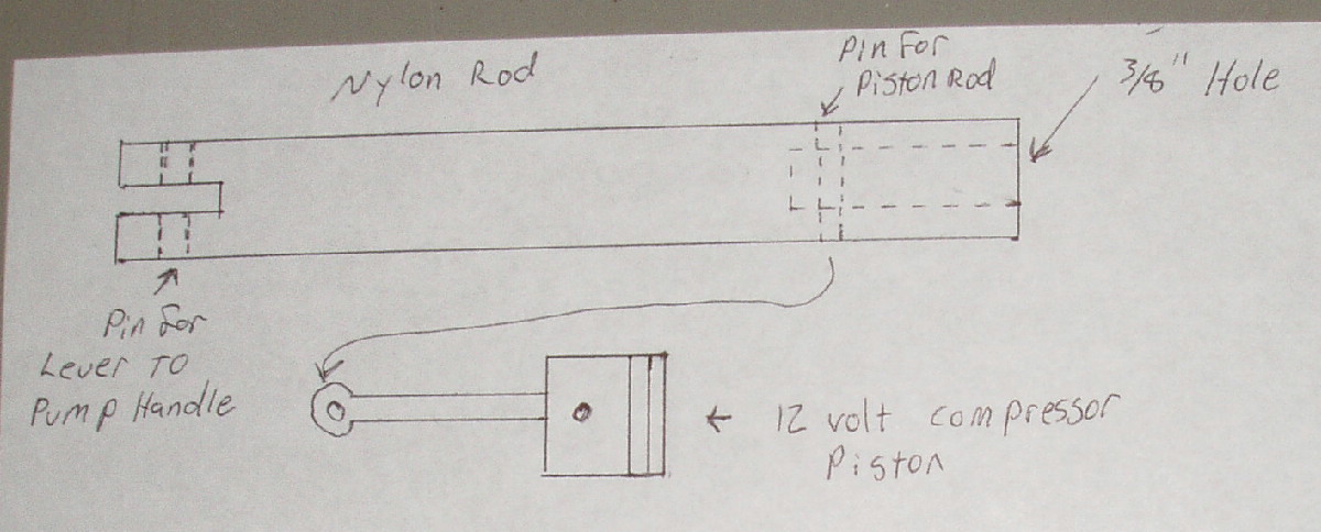 I don't want to take the piston assembly out because i put super glue on the pins to keep them from working their way out and scoring the cylinder walls. I drew this picture to try and show you whats inside. The piston had a piston arm attached to it so I drilled a hole in the end of a nylon rod big enough to allow the piston rod, then drilled another hole to put a pin through the piston rod. There is a little space between the piston and nylon rod to allow the piston to move freely just a little separate from the nylon rod.