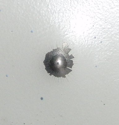 -saboted 0.177" steel BB (see pictures for foil sabot construction) - full penetration of a sheet of 0.6mm steel, denting a second sheet