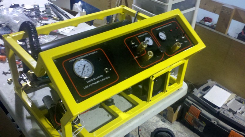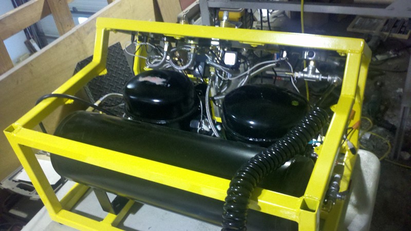 I setup my big 2 inch cannon with a 2 gallon tank and timed the fill. Now, as a baseline, keep in mind my previous compressor system (twin 12 volt truck airbag compressors) required 4 to 5 minutes to charge the tank to 250 psi depending on the state of charge of the car batteries I used to run them. With this new compressor, I tested the fill time in two ways;