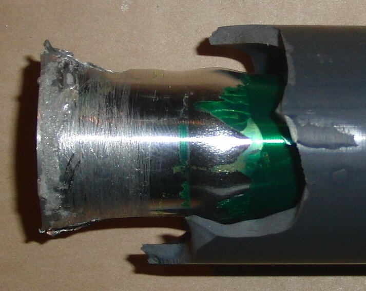 Here's an obviously failed attempt to stop a very fast and (pre-lathe) not too light "piston" with an air bumper, that's a lot of pressure to bulge the metal like that, and the space between alloy and PVC was filled with epoxy! The solution to that problem was the one I am suggesting here, a smaller diameter and lighter weight piston which made bumper material almost unnecessary.
