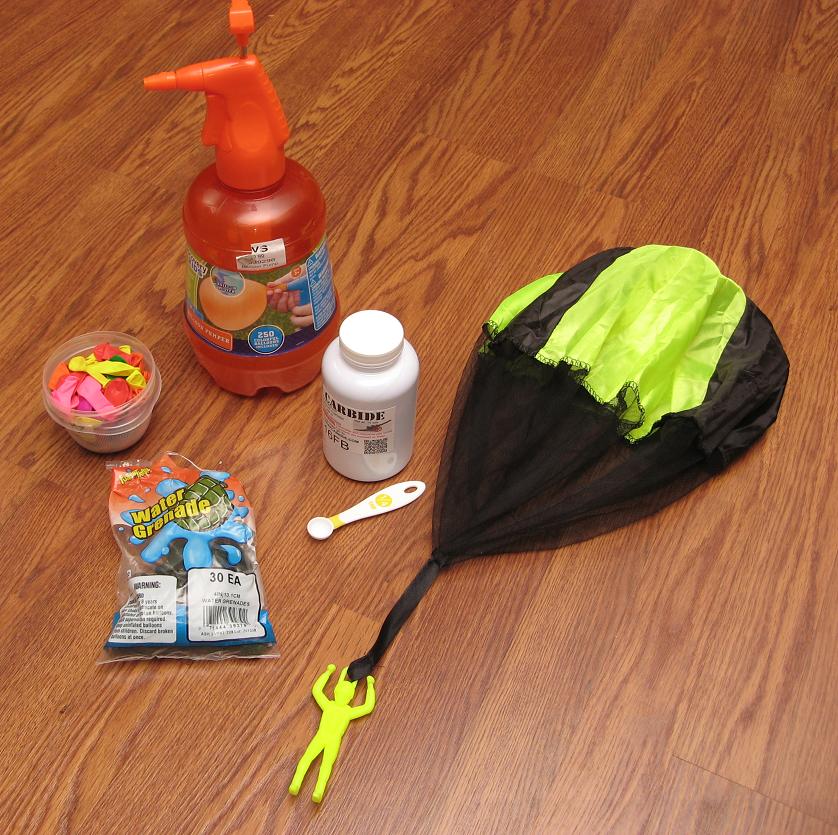 I found this little water balloon tank at CVS, it does 3 functions: fill balloons with air, water or shoot a mist. So it will hold some pressure. I cut the pickup tube inside that pulls up the water so insted it pulls in the acytlene wich mixes with the water. The volume of the tank is about what my 3" cannon uses so i use the same amount of carbide in the tank. Each balloon uses 5 pumps to fill the balloons making the perfect little charge to shoot the empty pop bottles and the little parachute figure. The air to gas is very consistant and WAY more effecient then the cannons wich use 1/4th tsp per shot. This setup will shoot the rockets about 10 times per 1/4 tsp of carbide.