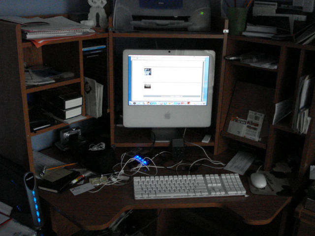 That's the top of the desk: 20inch Viewsonic monitor, speakers, iPod, phone, webcam, SD Card Reader, Calculator, wallet, and empty milk glass.