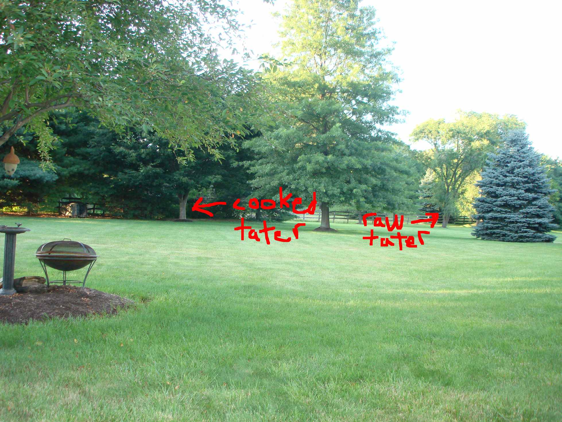 EDIT- Here's the pic. How far is your estimate? Me an my neighbor both have an acre of land, if that can somehow help. The distance from me to the "cooked tater" tree is close to 130 ft, if I remember right.