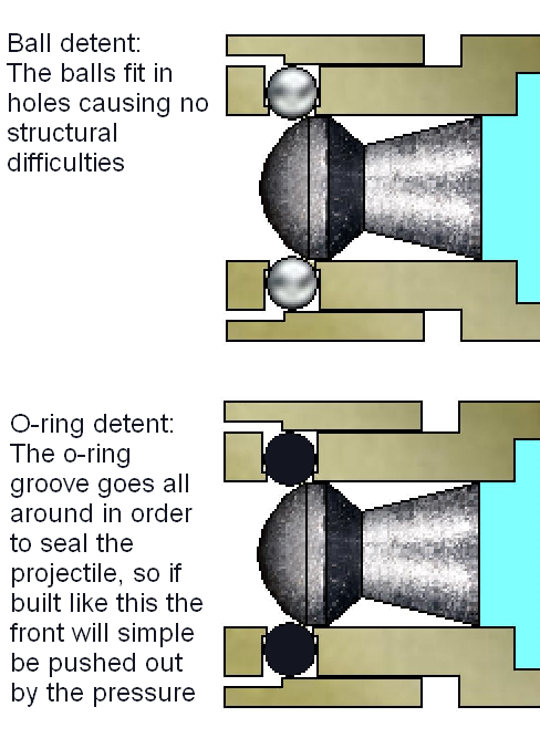 An o-ring detent is however preferable for several reasons, namely it has the dual function of both holding and sealing the projectile, as well as holding the projectile over its entire circumference as opposed to specific points like the ball detent.