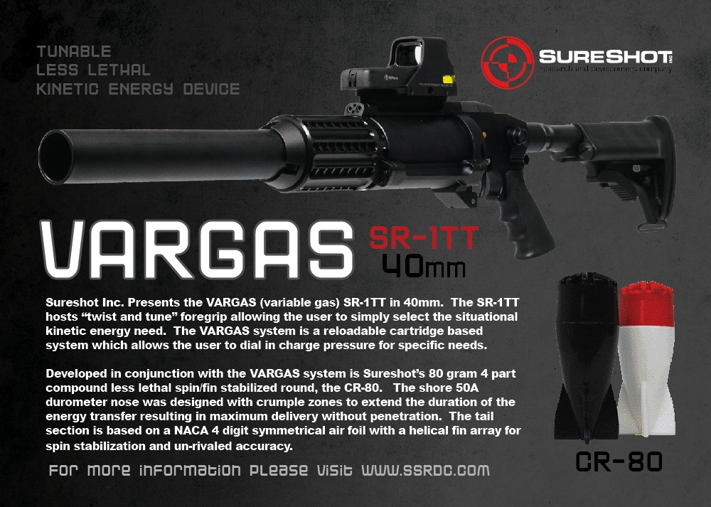 Check out our flyer from the show. Rubber balls are OK, but drag and accuracy suffer. Our CR80 round has great stability and speed profile. One of the major issues with the shotgun bean bag rounds is that they are lethal up close and wildly inaccurate (some are not hitting target at distances of 25'!) With an efficient design the speed profile is more consistent and offer non lethality at the muzzle while maintaining energy over longer distances. On the flyer you can also see our Twist and Tune design. The foregrip area twists, to expose port openings offering 25% reduction in energy (with the CR80). Interesting concept, and all the rage with the non lethal folks but in my opinion but unnecessary with a well designed round.