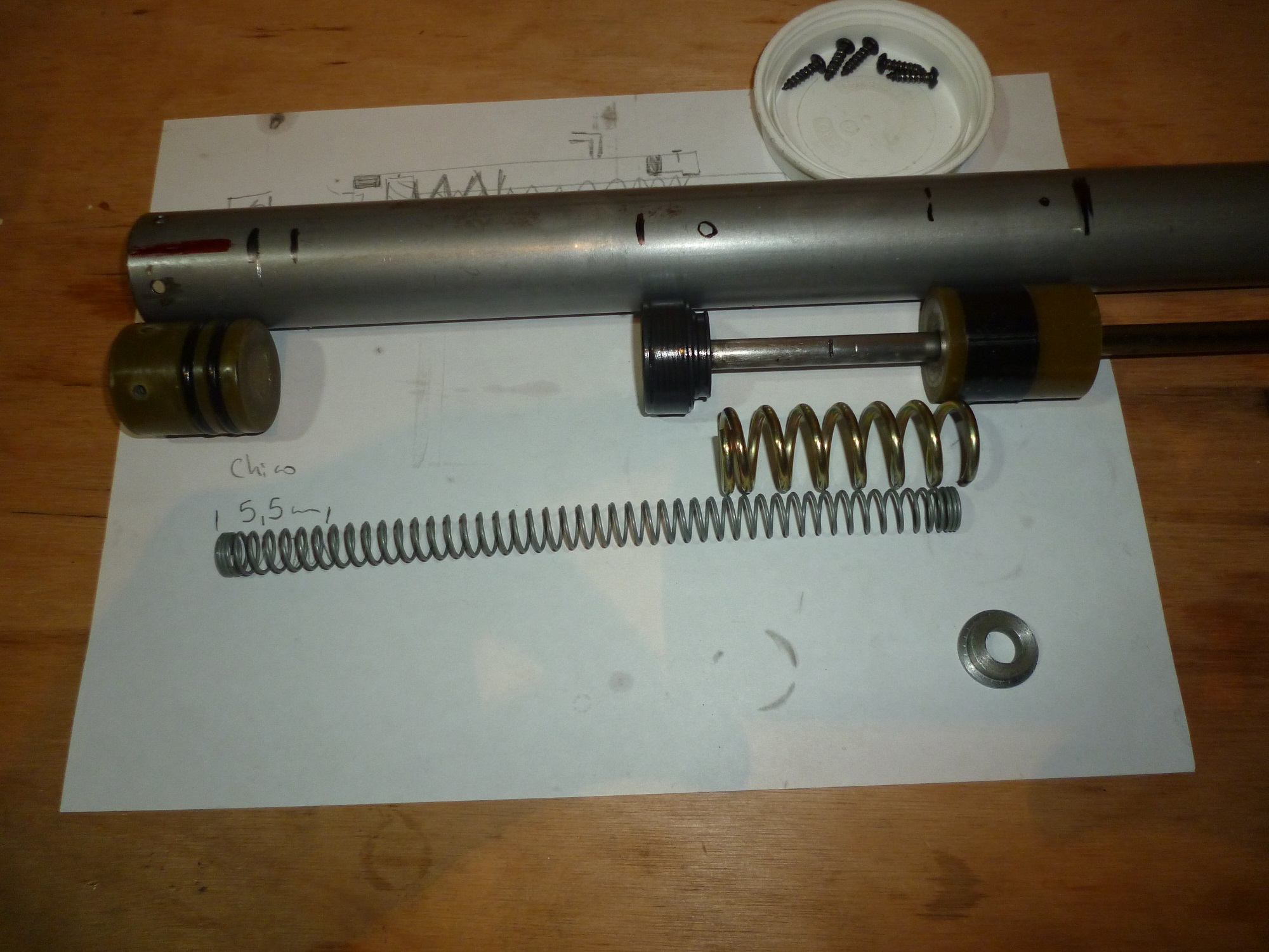 This has double spring. One is to return the piston and clean the combustion chamber, it is the thinnest. The other, the largest, is responsible for retaining the piston in its position when compressing the air-fuel mixture. The small spring runs inside the large spring, which is very hard. When combustion occurs, the pressure peak further compresses the large spring, and the outlet orifice is opened.