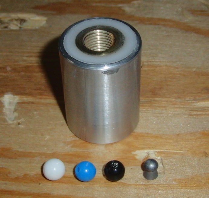 This time round, I used the aluminium tube and hammer-fit epoxied delrin endcap construction that has served me well with high mix hybrids. I also have a selection of plastic bead sizes (7.59mm, 7.88mm and 8.10mm) to choose a blocker from. The centre bore should allow the barrel gasses to leak out, though if that's still too loud I'll block it up. Blowing through the thing easily lifts the beads to block the muzzle, my fear again is that it will strike the pellet on the way up.