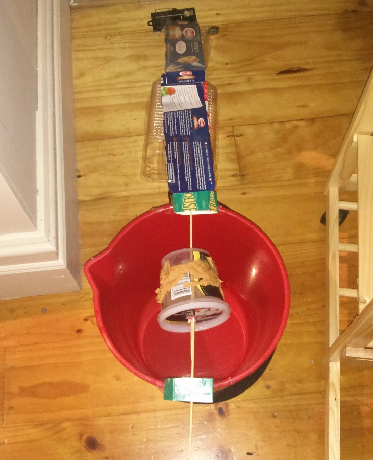 Also, after complaining of a mouse infestation and asking me for advice (while also specifying she had no guns in the house so shooting them was not an option) my sister built one of these!