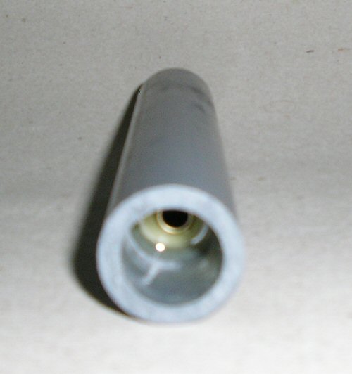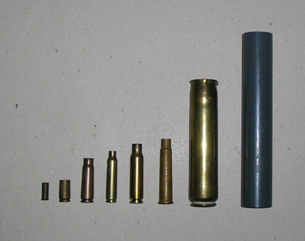 - Basic components - the "barrel" (actually an air duct) with rubber tubing added epoxied in place (with the epoxy smoothed down to streamlined shape in my "lathe" - a drill clamped in a vice :D ), the epoxy piston (now sanded down to give a smooth face), syringe tubing (which still has to be cut down) and cut down schrader valve. Next to the PVC body is a genuine WW2 20mm cartridge for scale, the actual caliber of the launcher will be 19mm