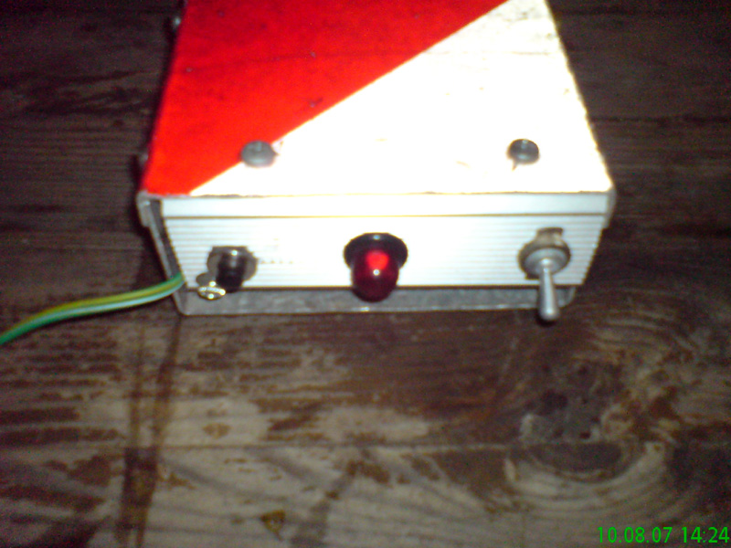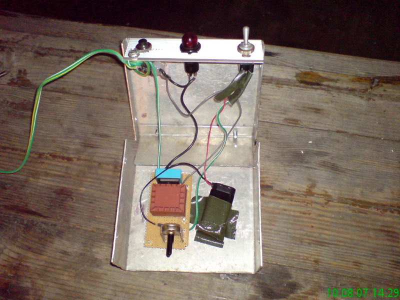 selfmade flyback circuit charges capacitor. Capacitor is discharged through a car ignition coil for the spark, a big spark.
