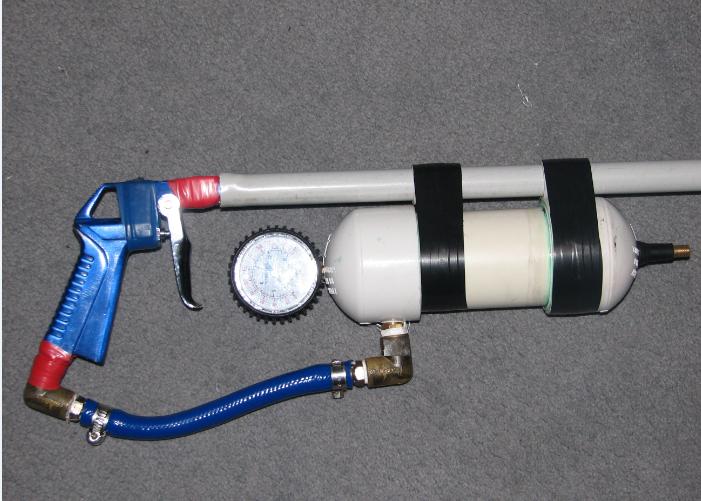 The pic is fairly self explanatory, the barrel is approx 7.5mm ID, and fits nicely in the blowgun, some of the barrel is sleeved with 20mm pipe, heated up to slide over the outside of the blowgun. I Run this gun at around 90-120PSI.