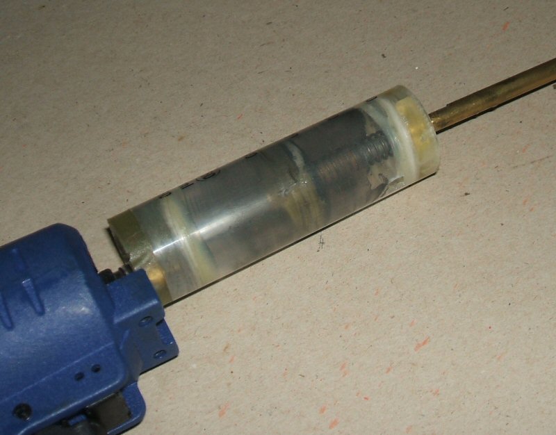 I basically replaced the nailgun's hammer piston with a 6mm port that fed into the blow forward breech I had made. I was expecting a considerable increase in power, it turned out to be a little too much however - on the first shot the bolt piston as well as the front end of the breech were shattered. as you can see from the attached photos, the bolt is jammed forward instead of having been returned by the spring. I blame this mostly on the air vent I had but at the bottom of the outer tube, had it not been there I'm sure the air being compressed would have cushioned the impact of the bolt.