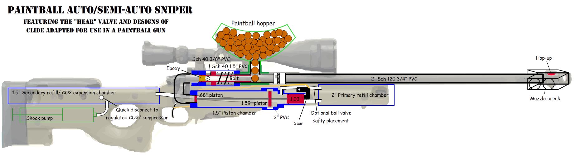 Then I found the Slider and the GB semi, both by Clide. I took design ideas from their diagrams: The Slider and The GB Semi. If you do not understand my diagram, see these forms! The Slider shot paintballs semi-auto at a high velocity, but the pilot air was wasted. The GB Semi was more efficient, with no waste, and shot golf balls semi/auto. By scaling the GB Semi down, I came up with these plans.