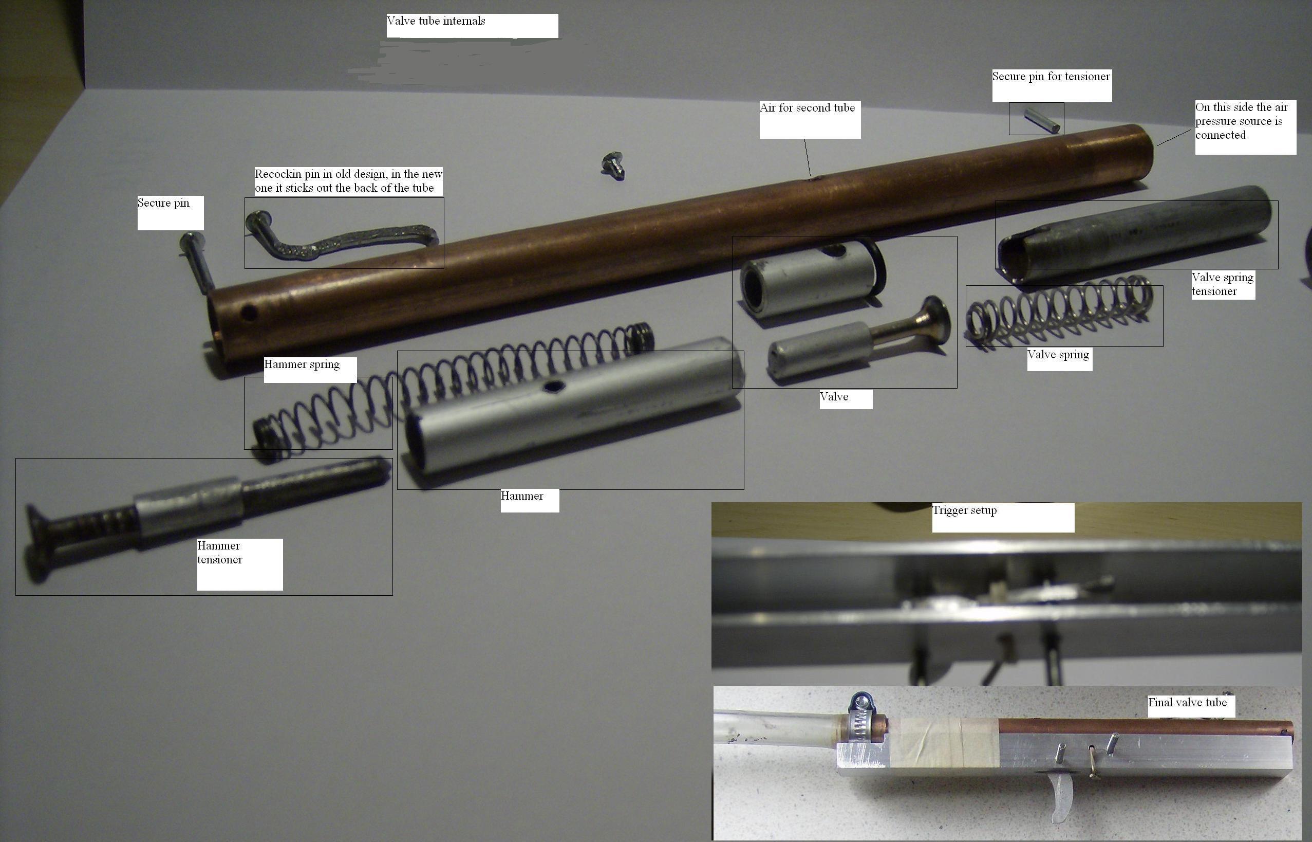 This is my older airsoft bb gun (it works with 6 mm platic balls; 0.12g). In this design I was working with the stacked tube working as I wanted to make a semiauto gun; based on most spyder paintballs guns. The whole gun is made from scap (everything homemade) from the valve to the soldering of the piping. Further, the gun shoots above 100 m/s (around 360fps). I tested this using a mp3 player and a measured out range for a target. When one shoots you can hear two loud parts(when the gun shoots and when the ball hits). Using audicity you can c how many miliseconds is between the two. By subtracting 340/range from the time that u got you get the exact time (bc the speed of sounds goes at 340m/s and affects your recording). So average speed= distance/time taken. Like this I made an easy and cheap chronograph. The gun runs on compressed air at around 5 bars. As can be seen it is stored in a coke bottle. This way you can shoot about 30-40 times on a 1.5L bottle (0.4 gallon). The guns speed can be regulated'' by the spring which drives the hammer into the valve. The gun can be loaded at the top but I still have to make a magazine. Everytime the gun is shot the barrel slides forward due to friction of the ball and air on the inside of the barrel and thus opens the breech and allows for reloading. Once the gun is recocked (as seen in the picture) the breech closes again due to a pin which connects the barrel and the hammer setup.