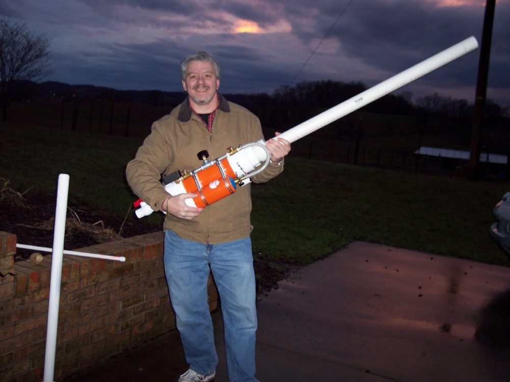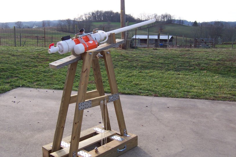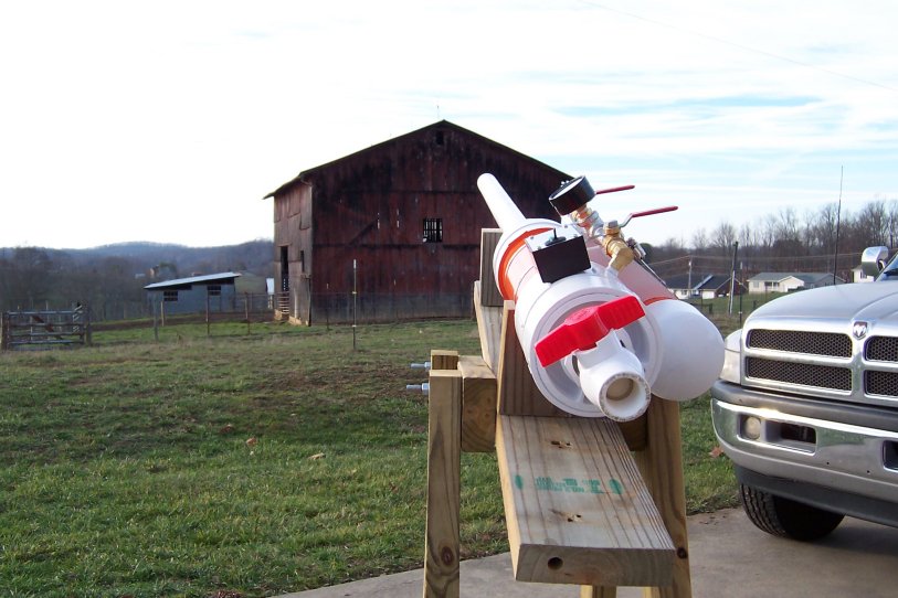 Shooting this thing is a little awkward in that we almost totally ignored human ergonomics in the design, something that won't happen next time. However, because the meter pipe is so well anchored down, it became a handy right hand holder with the left operating the firing stungun underneath.