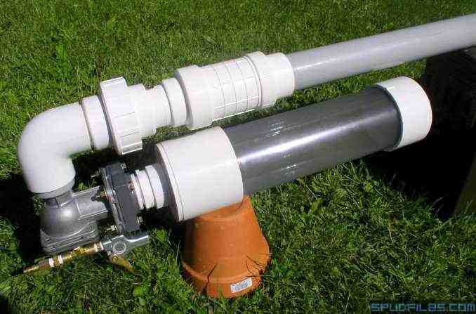 The chamber is made of 4" clear pvc. I had planned on using it for a combustion, but couldn't resist the coolness of a clear pneumatic. When fired, the chamber becomes filled with vapor from depressurization.