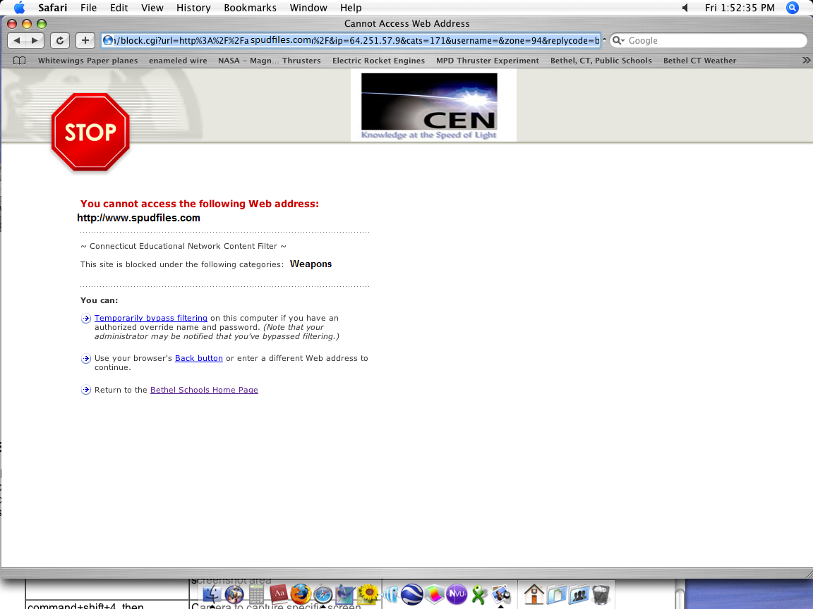 Sigh. It happens to any good site at my school. If it's not block it's expected to be within 2 weeks. My school uses the Connecticut Educational Content Network Filter. (CEN) I get around it with a proxy that mysteriously hasn't been blocked the entire year. It scould be because it only works if you persistently refresh the page until the remote host wakes up from its nap. Anyway, I can view the page but I can't log in... Kinda pointless for this site. Would anyone know how to do this or maybe find another way? The proxy I typically use is http://www.surferclam.com and use the phproxy. Or if you want we can talk about other frustrating systems like CEN. BLARG I HATE CEN!!! :evil:
