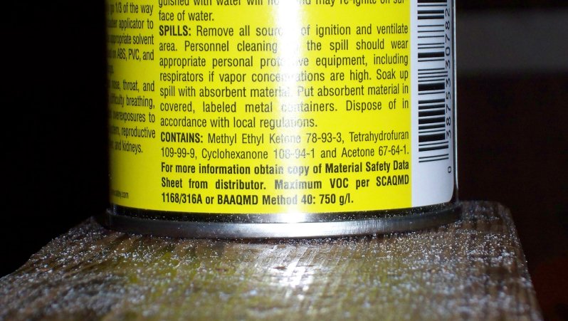 Hmmm, it's interesting that their labels list the same ingredients, but the MSDS for cleaner doesn't list Tetrahydrofuran or Cyclohexanone. Anyone got any ideas why the MSDS wouldn't list them (it does on the clear primer MSDS).
