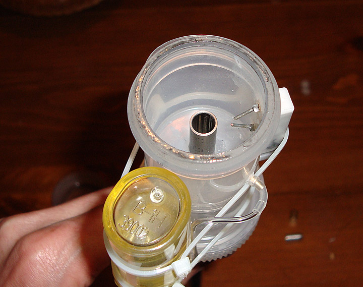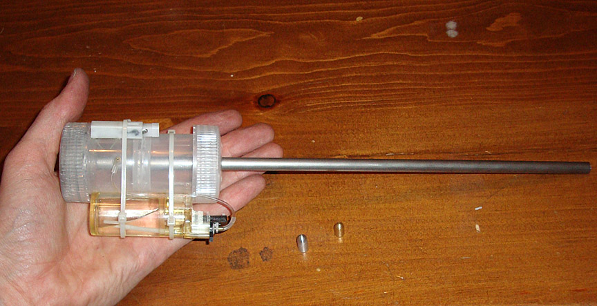 Presenting my first mini. The chamber is two Nalgene 1oz jars, glued back to back with LockTite plastic superglue (this stuff really works!) The forward jar is for storage, while the rear jar is the actual chamber. The barrel is a 12" piece of metal tubing with a 1/4" bore. At first I thought that it was steel because it definitely is not aluminum. But just tonight I tried sticking a magnet on it, and it does not appear to be ferrous material. Hmmm. Well, I found it lying around work so I'll ask around as to what it might be.