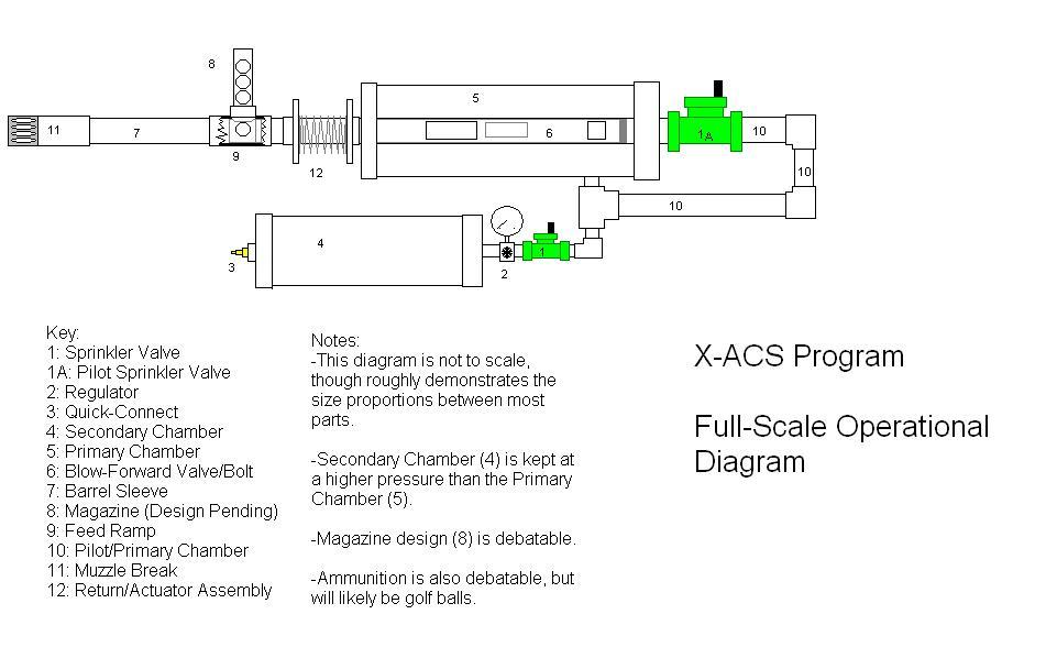 My next project after the Airburst system, and maybe a bunch of identical mortars for mass-fire, will be a Blow-forward Autocannon. It will use a single piston, and one sprinkler valve to actuate it, and another to shut off air flow to the primary tank when the piston is in the forward position to reduce air waste and to more easily re-seat the piston. When the piston is in the rear position, the airflow control valve (between primary and secondary tanks) will be open. When the piston is moving forward and reaches the point where the rear inlet on the sleeve is open, a roller switch will disengage, closing the air inlet valve and firing valve. The inlet hole on the piston sleeve will continue to allow pressurized air to push the piston forward. The air escapes through the barrel when the forward inlet reaches the inlet on the sleeve. Air escapes, and the spring returns the piston to it's rearward position. The rear inlet hole is not closed until the last possible moment to further aid re-seating of the piston. The moment the piston's rear inlet is sealed, the roller switch re-engages, allowing the inlet valve and firing valve to open again. In order to allow the cannon to have a reasonable rate of fire, the primary tank will be kept as small as possible while still allowing a reasonable muzzle velocity. The secondary air tank Will be kept at a higher pressure and will have a preset regulator installed just before the valve, also to ensure better air use. The tank will be constantly connected to a compressor. The finished gun will be to large and awkward to use as a handheld cannon. It's final construction and operation will be similar to the Browning M2.