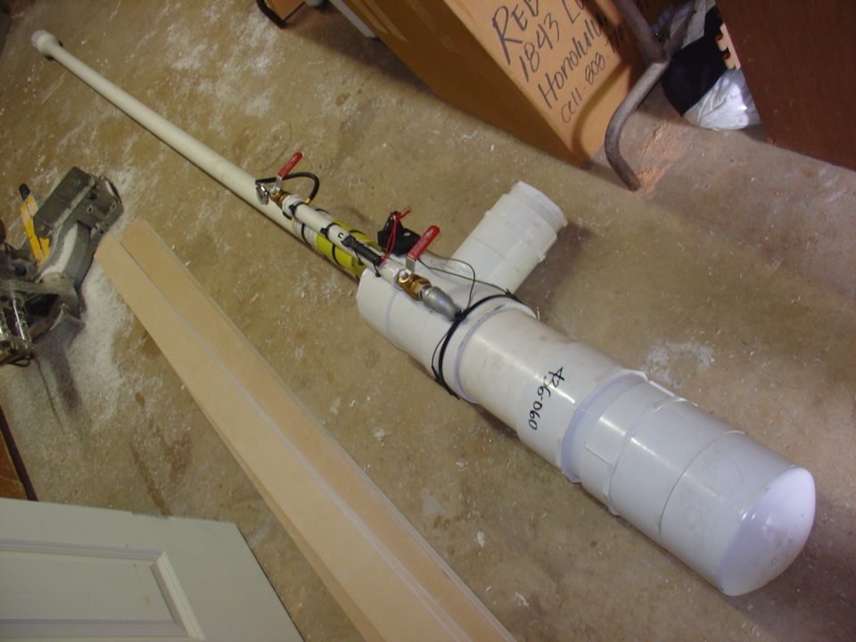 Recently assembled, giant coaxial breech loader. 144" barrel, 2", 450 cubic inches and 700 cubic inch 6" chamber. 18" long x 1" diameter metering tube (2 squirts to fill at 45PSI of MAPP gas) battery BBQ ignition with 2 gaps (one top, one bottom).
