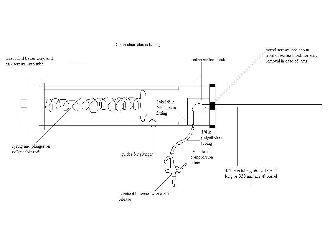This is a (very) rough sketch of what I'd like the in-line vortex BBMG I plan to build to include. I gathered all this from info I've been reading over the last few days. There are a couple of things I would like to take care of before I start building, though.