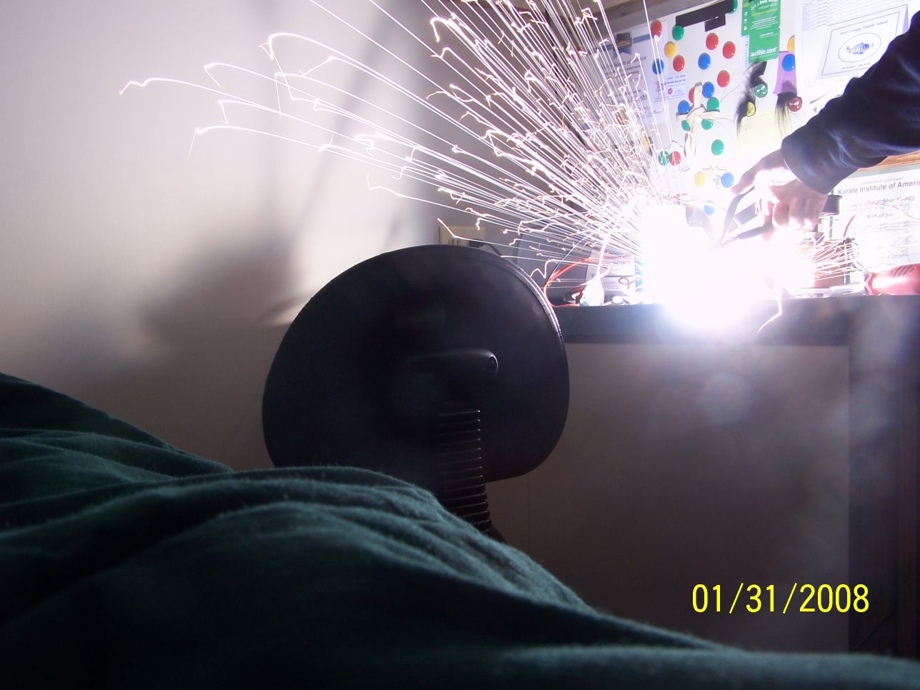 It's strange, in both photos (epsecially the first), there is at least one spark that completely changes it's direction in midair and comes back towards the gun. It's amazing how perfect the one on the first pic looks (it's the spark furthest to the right I'm talking about) I wonder why this happens??? Other sparks, like from where the capacitor touches the leads, the sparks either fade or break apart. Aluminium sparks seem to be different.