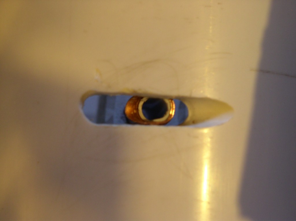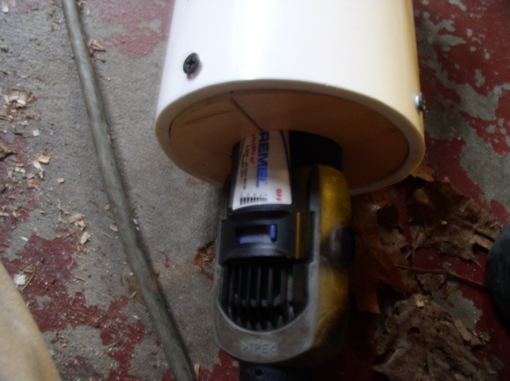 After seeing the Mythbuster's confederate steam machine gun I considered the idea for a airsoft gun using the same principal. First of all I have condemned this idea temporarily because it is horribly inefficient and would chew through a battery pack pretty quick. It's powered by a Dremel rotary tool that has a max no load speed of 35,000 rpm, but the gun starts to destroy itself when pushed beyond 2/3 throttle. The barrel is made of copper tubing sleeved over a bic pen body. The drive block is made of Azec PVC outdoor molding (it's like a really dense PVC foam). Those four bolts push on a collar the goes around the neck of the Dremel to center it and stop the barrel from rubbing on the guard. One problem is that BBs hit the exit slot and destroy the end of the barrel but for some reason the gun never stops running even when they get jammed. All in all is has lots of flaws but it's current state is what it will stay for some time.