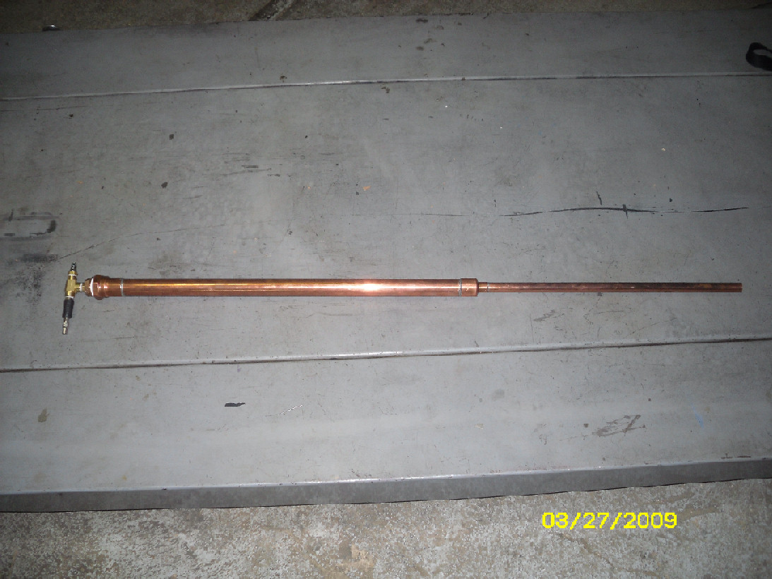 Type L... solder/thread adapter on pilot end, 1" to .5" reducer(solder/solder) on barrel end, brass 1"to.25" bushing for pilot, brass .25" close nipple to .25" tee, fill schrade on one leg, fire schrader on other....Carlman wrote:what type of copper is it made out of...