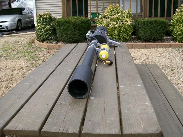 The BL-520 is a combustion potato launcher based around a piece of 5" PVC as the chamber, and a 60" long 2" diameter spud-cutting barrel. There are a number of unique things about this cannon, one being the fact that the barrel comes all of the way through the chamber for breech loading action when you screw off the back of the cannon. The other unique features are the fully custom machined aluminum pistol grip igniter, a plunger action MAPP gas meter/injector, and custom clamps and mounts made to hold it all together. When this was shipped to me, I knew it was going to be a serious cannon, but I really underestimated the size until I received the box.