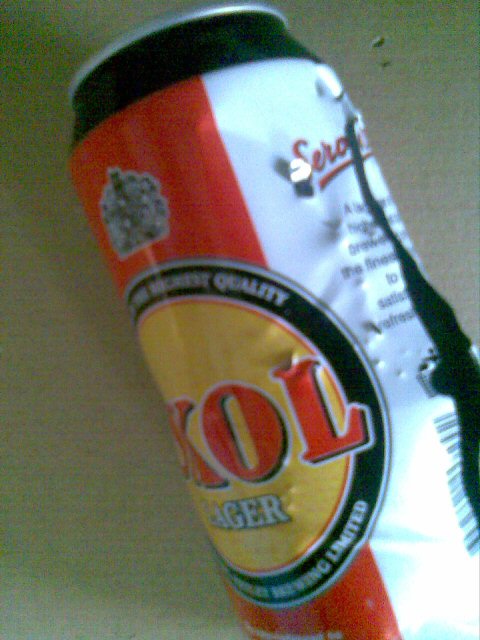 I have long been aware that high velocity lead striking a hard surface tends to disintegrate like a minature grenade but a recent shooting session illustrated the kinetic energy these fragments retain. I was using a granite slab as a backstop against which the lead pellets were fragmenting, the beer can illustrated was in line with the slab about 2 inches away from the point of impact. As you can see some fragments actually penetrated both sides of the aluminium can.