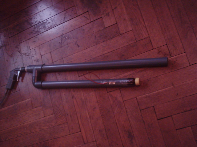This is my new hybrid shotgun.It works on the principle of my coke bottle hybrids.It don't have ignition yet.The barrel is removeble so I can easyly put the burst disk.This makes me some problems.Sometimes it launches the barrel if it isn't well plased.
