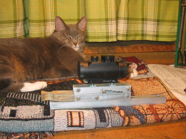 Below are some pics for a thumb operated self-elevating scope mount. The range is from 0 to 30 degrees. There are notches cut out at 5-10-20-30 degrees that click at those points so you can tell by feel without looking what elevation your at. It's mounted on the top barrel support for the 7 shot semi revolver I'm working on. Made out of 1/2" channel, a scrape of plastic deck lumber a spring and some pins, total cost without the scope is about $2.