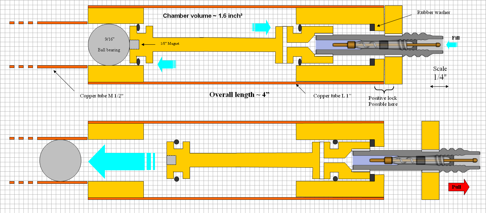 Here’s my most recent concept drawing: a kind of miniature QDV, with integrated Schrader valve inside the piston. I would like very much to have your opinion on it as I really want to build this one in a month or so.
