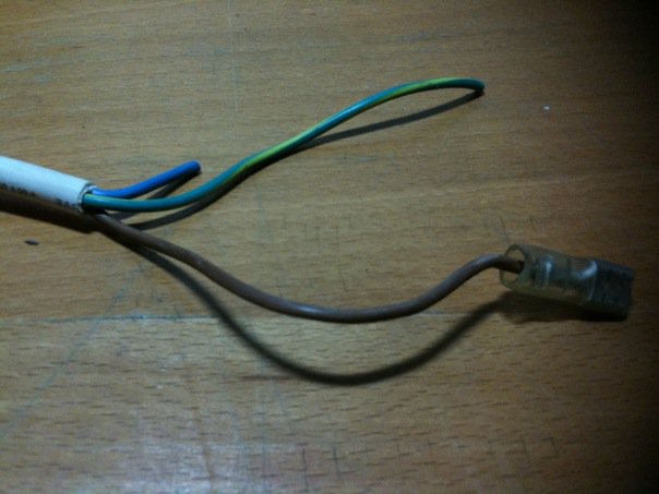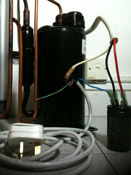 The neutral wire (blue) from the plug goes to the capacitor's black wire. The white wire from the compressor goes to the plug's live wire (brown). The earth wire is connected to the copper pipe. Here's a photo.