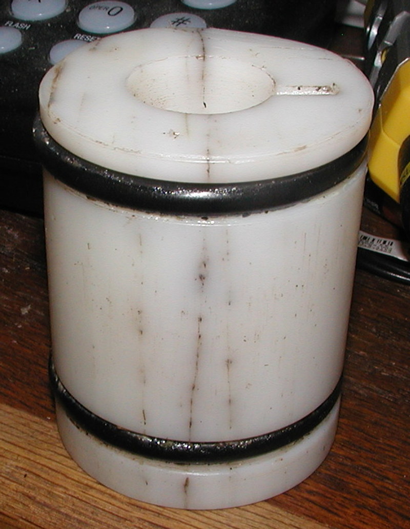 I make these pistons by cutting 2" circular holes with a holesaw in a cutting board and then heat them up and press them together. Then turn them down on a drill press. I guess when I heated and pressed them together, I didnt do it good enough. This happened on my first piston but I was able to break it with my hand, this piston took about 50 psi to seperate it.